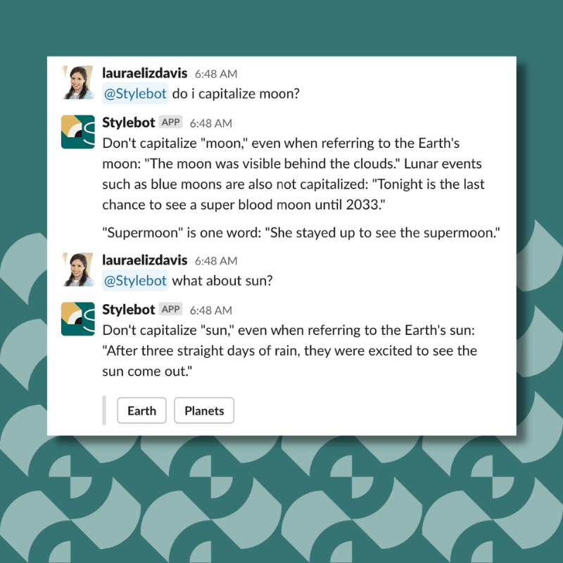 💌 A tip a weekIf someone forwarded you this email, subscribe here to get one writing tip a week in your inbox. 💬 Get reliable, ethical writing advice at your fingertipsImproving your writing means making better choices every day. Stylebot makes it easy with our Slack, Teams and Google Chrome extensions. Try Stylebot for free today. 📝 About StylebotStylebot helps media professionals save time without sacrificing quality by answering editing questions on Slack, Microsoft Teams and Google Chrome. We're on a mission to make editing faster, easier and more fun ✨ Learn more about Stylebot or follow us Instagram, X or LinkedIn.
