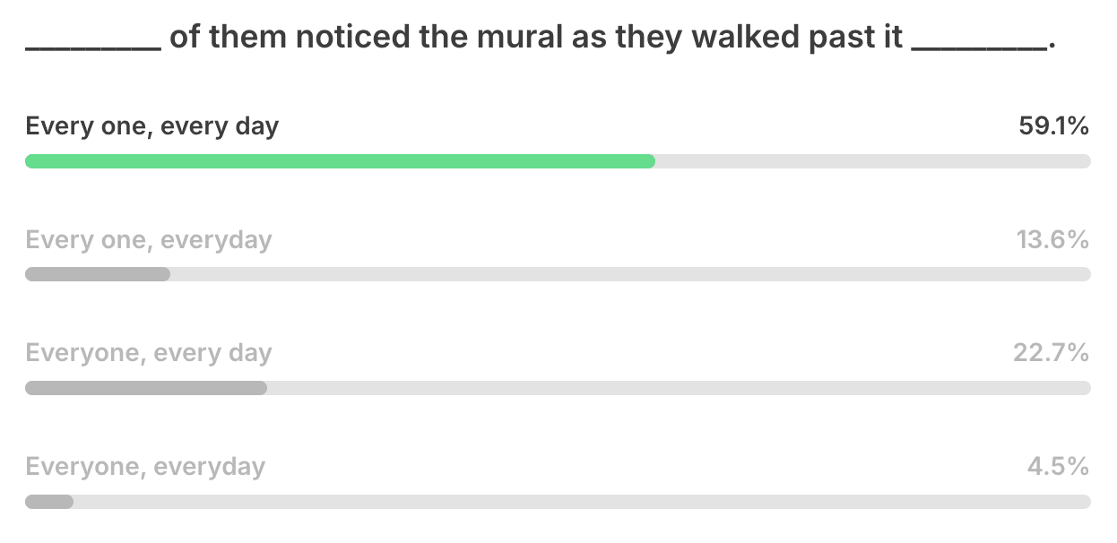 Every one of our newsletters is designed to give you a writing tip you can use in your everyday life. See what we did there? If you remember last week's quiz, you might already know whether or not you got the right answer. If you need a refresher, we quizzed you on the use of "every one/everyone" and "every day/everyday." And most of you got it right! You needed the two-word versions of each term to correctly complete the sentence: "Every one of them noticed the mural as they walked past it...