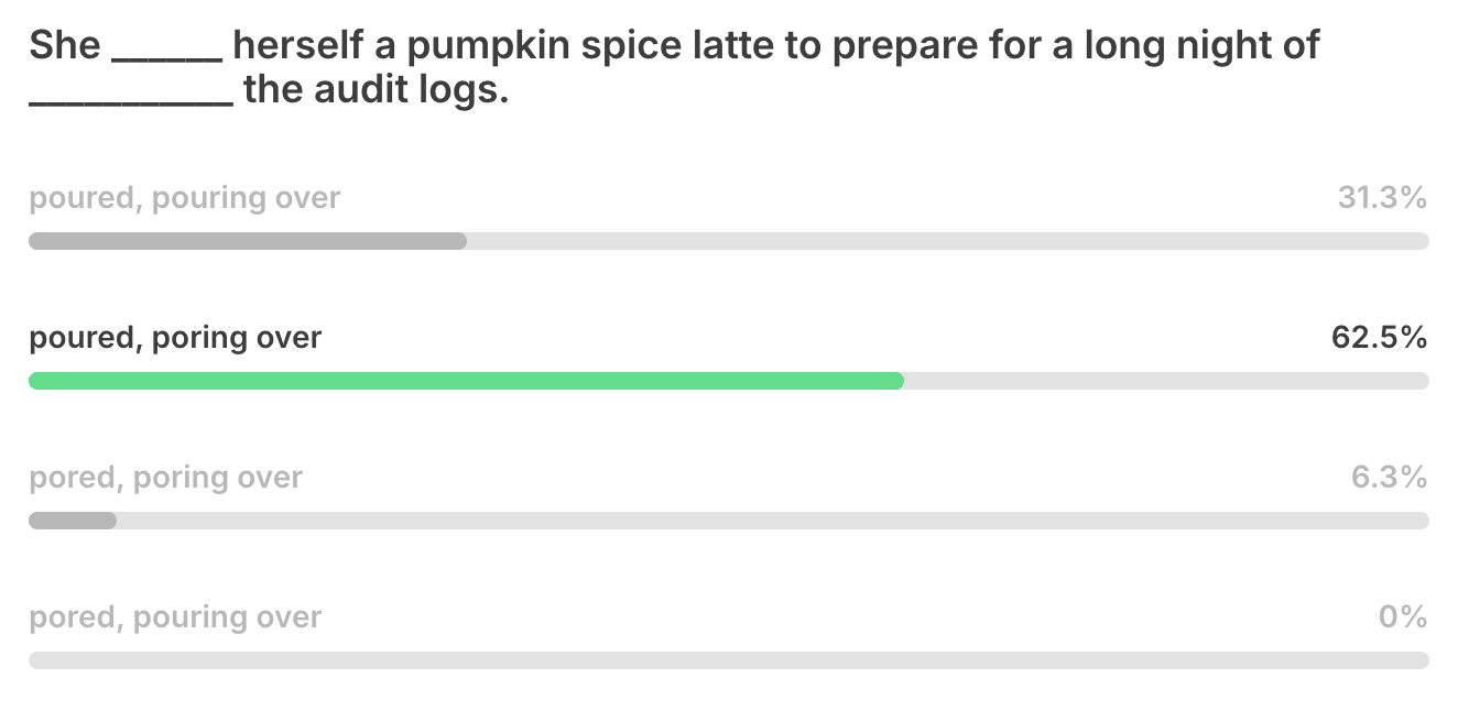 If you chose "pouring over" in last week's quiz, did you associate the act of studying intently with poor posture? Perhaps pore and pour's fellow homophone can help you remember the correct phrase. Almost everyone who took last week's quiz correctly identified "pour" as the verb to use for serving drinks. But nearly a third of you chose "pouring over" for the act of studying the audit logs, when the correct phrase is poring over. When you hear the phrase "poring over," you might picture...