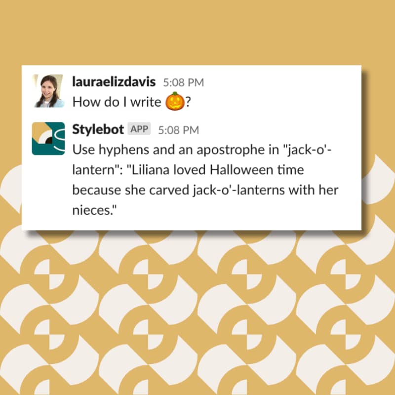 We had a tie in last week's quiz about how to punctuate the term commonly used for carved pumpkins, with 35% of you choosing "jack o'lanterns" and another 35% choosing "jack-o'-lanterns." So who's right? Let's ask Stylebot 😉 It's tedious, but we put the hyphens and an apostrophe in jack-o'-lantern. Another common format is "jack-o-lantern." "Jack o'lantern" is much less common. So who is Jack? And what's he doing with a lantern? Here's where we tell you what carved pumpkins and marsh gas have...