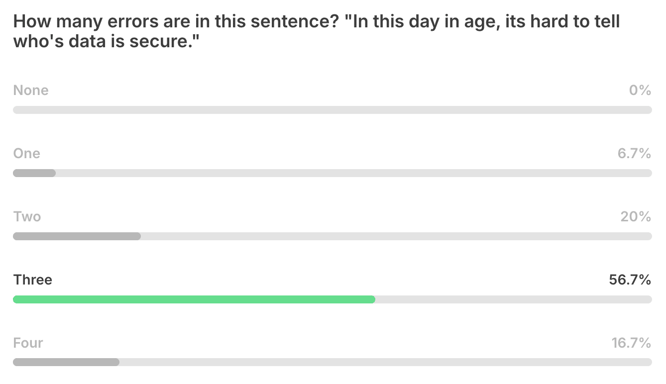 Happy Halloween! We definitely didn't scare you off with last week's quiz. In fact, more of you answered than usual, and more than half of you got it right: Here's how we would write the sentence: In this day and age, it's hard to tell whose data is secure. So we count three total errors that we put into two buckets: