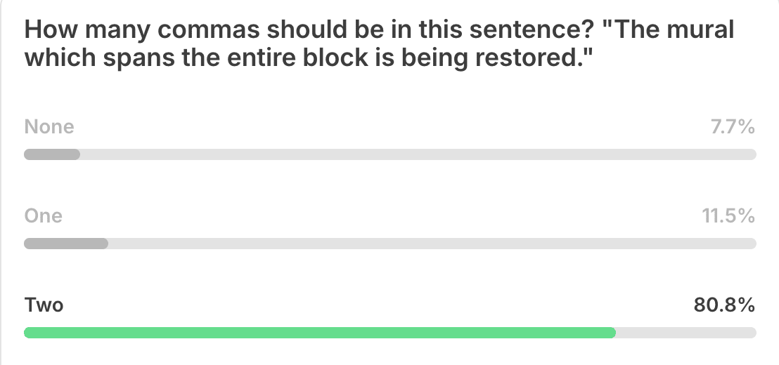 It's hard to miss a mural that spans an entire block. It's much easier to overlook missing commas. One word would have changed the answer to last week's quiz, which most of you got right: Here's the correct sentence: "The mural, which spans the entire block, is being restored." However, if you change "which" to "that," the correct answer is none. Why? Which introduces nonessential clauses — that is, clauses that don't change the main point of the sentence. That introduces essential clauses,...